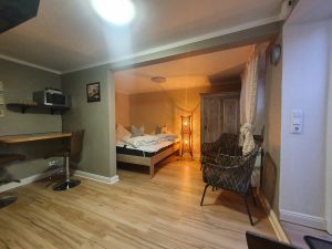 Die liebevoll eingerichtete Einraum-Ferienwohnung im Erdgeschoß hat 25m² Größe, wurde 2022 umfassend renoviert und bietet Platz für 2 Personen mit einem Hund.